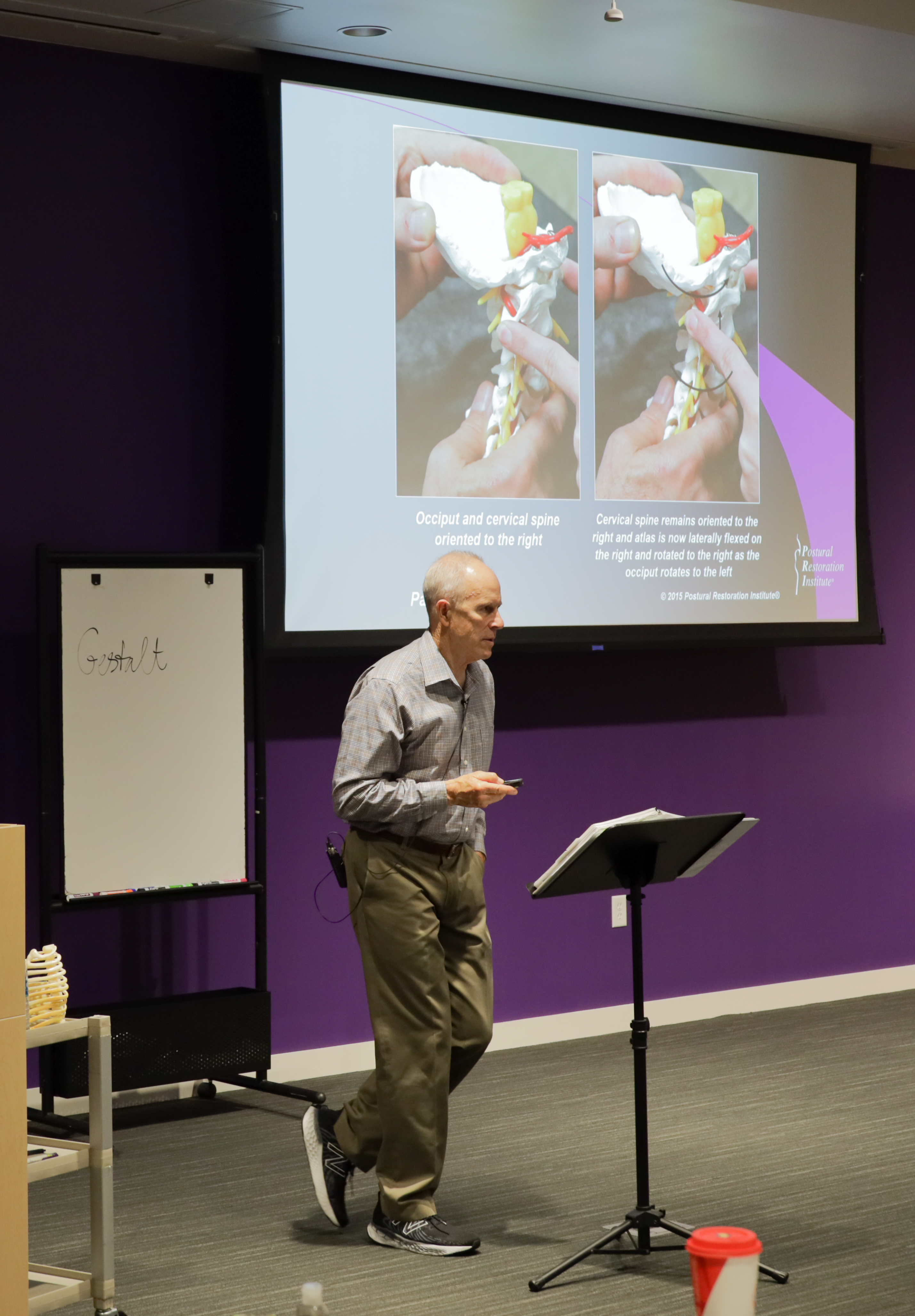 This is a course about the cervical spine and the need for revolvement that maintains alternation side to side, brainstem oscillation, temporal bone "wobble" and a jaw that can freely move side to side to keep a neck and nervous system in balance of an asymmetrical human that can stand erect and move fully and freely. Atlas and occipital bones make up a highly neurologic articulation with a brainstem and autonomics that are intimately connected to this highly reflexive region. This course is the gateway to the cranium and the introduction to top down as well as bottom up concepts of PRI. The cervical, cranial and occlusal systems are all integrated in this course and an impressive demonstration for all, especially the dentists, was provided with a simple mouth guard that Ron made for Louise the day before the course started. I demonstrated this stomatognathic example with Louise by first testing her cervical spine with a mouth guard that gave her right molar contact and reinforced her RTMCC pattern resulting in positive tests of her cervical spine. Another mouth guard was then utilized that dis-occluded her right molar contact while giving her left molar contact sense and all of her tests became negative immediately. This demonstrated the neurologic effect of a simple mandibular appliance on not only the cervical spine but the entire neuro-respiratory-biomechanical system.